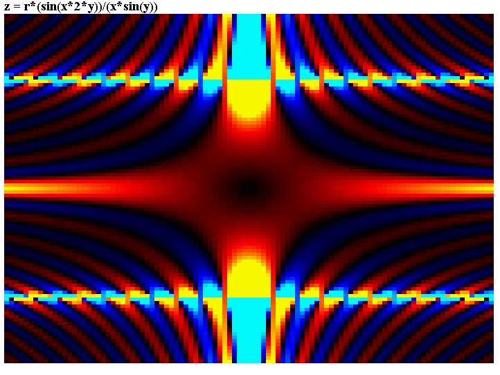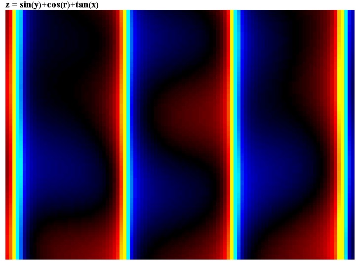 - A 3D function grapher that takes an equation involving x, y, z, and r, and graphs it on the x, y, and z axes. (Values for x and y are drawn in the usual 2D way, with z values represented by color.)